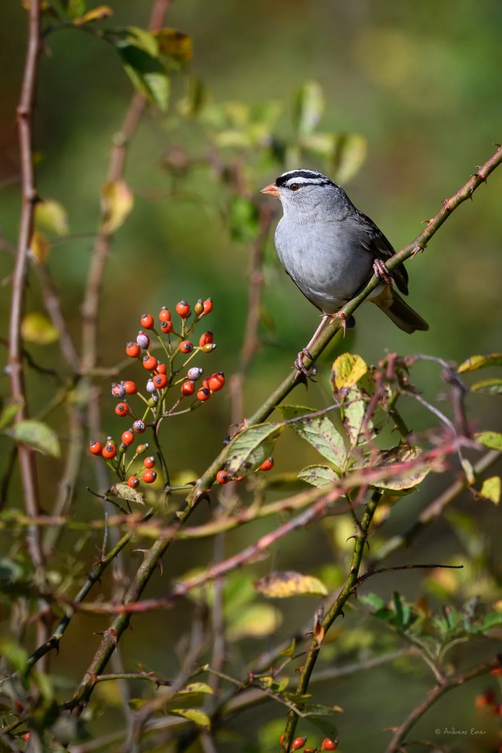 Most birds have migrated south already but I found a few White-crowned Sparrows feeding on berries and seeds in the brushes at the edge of the woods. Nothing says more about the season than having the bird perched next to some ripe berries in a bush almost bare of its leaves.