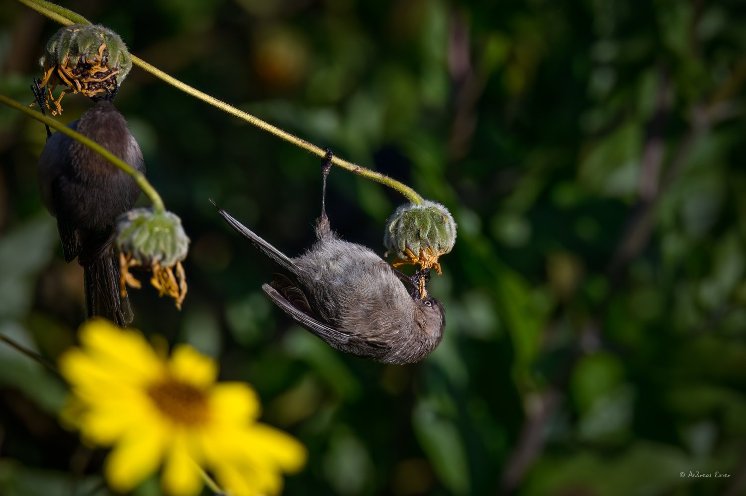 There was no way that I would get a picture with the camera on tripod with the little Bushtits moving from one flower to the next very quickly. I tried not to move around erratically with the heavy long lens attached, so I focussed on an area and followed the birds as they moved along.