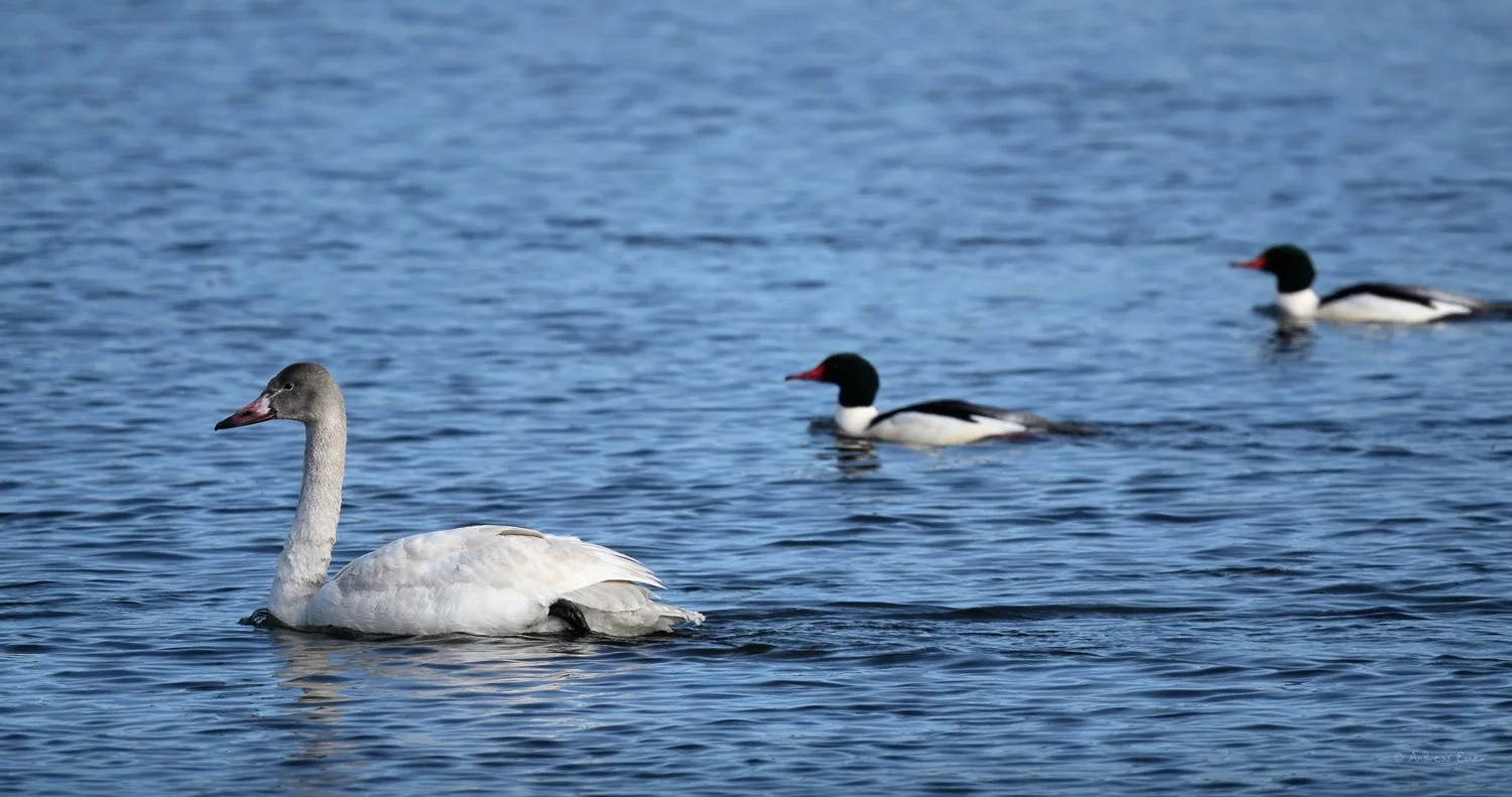 Here is the bonus shot. This juvenile Trumpeter Swan just swam along the shore with some male mergansers in tow. The head is still gray but the rest of the plumage is already getting snowy white and shows that the bird will be considered as an adult soon. Trumpeter Swans need the open water for feeding aquatic plants and the ice on its bill is proof that this bird had foraged earlier this morning.