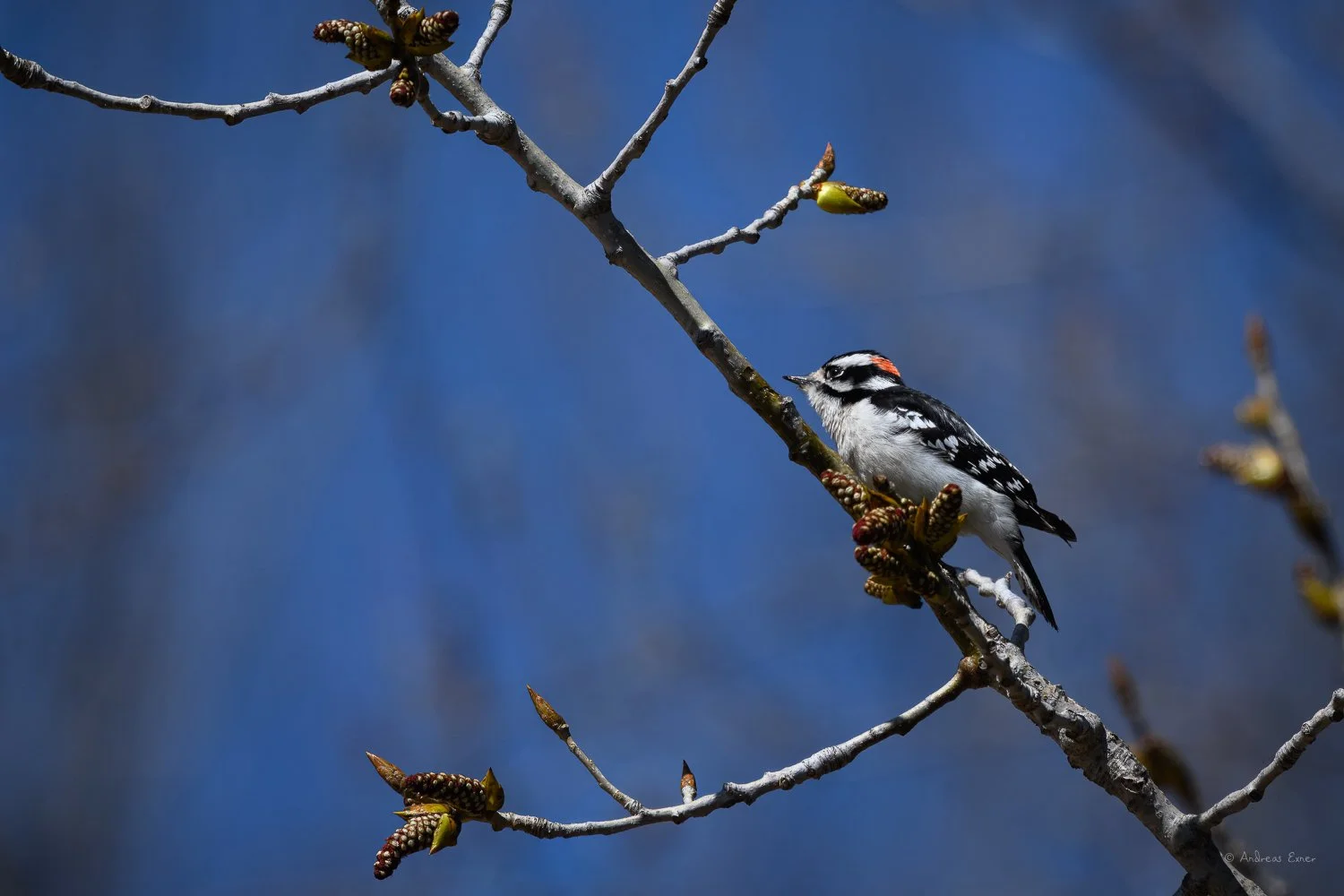 Here is a little size comparison. While the Pileated is is about crow-size and the largest woodpecker we can find here, our smallest one is the Downy Woodpecker, with a body of maybe the size of a fist. Both photos were made in the same area, less than 50 yards away from each other.