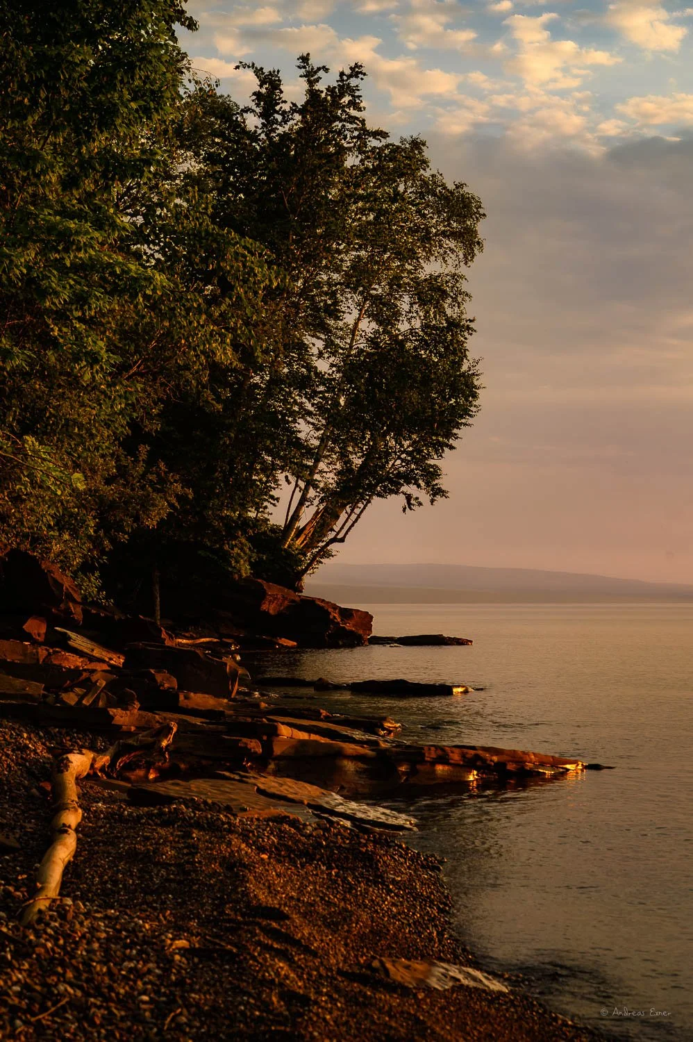 The color of the sky and the haze in the air were the result of wildfires that burned up north in Canada and the smoke got even worse the following days. A big cloud on the horizon made for an early disappearance of the sun, but for a brief moment the rugged shoreline of Lake Superior got a warm touch as I was hoping for.