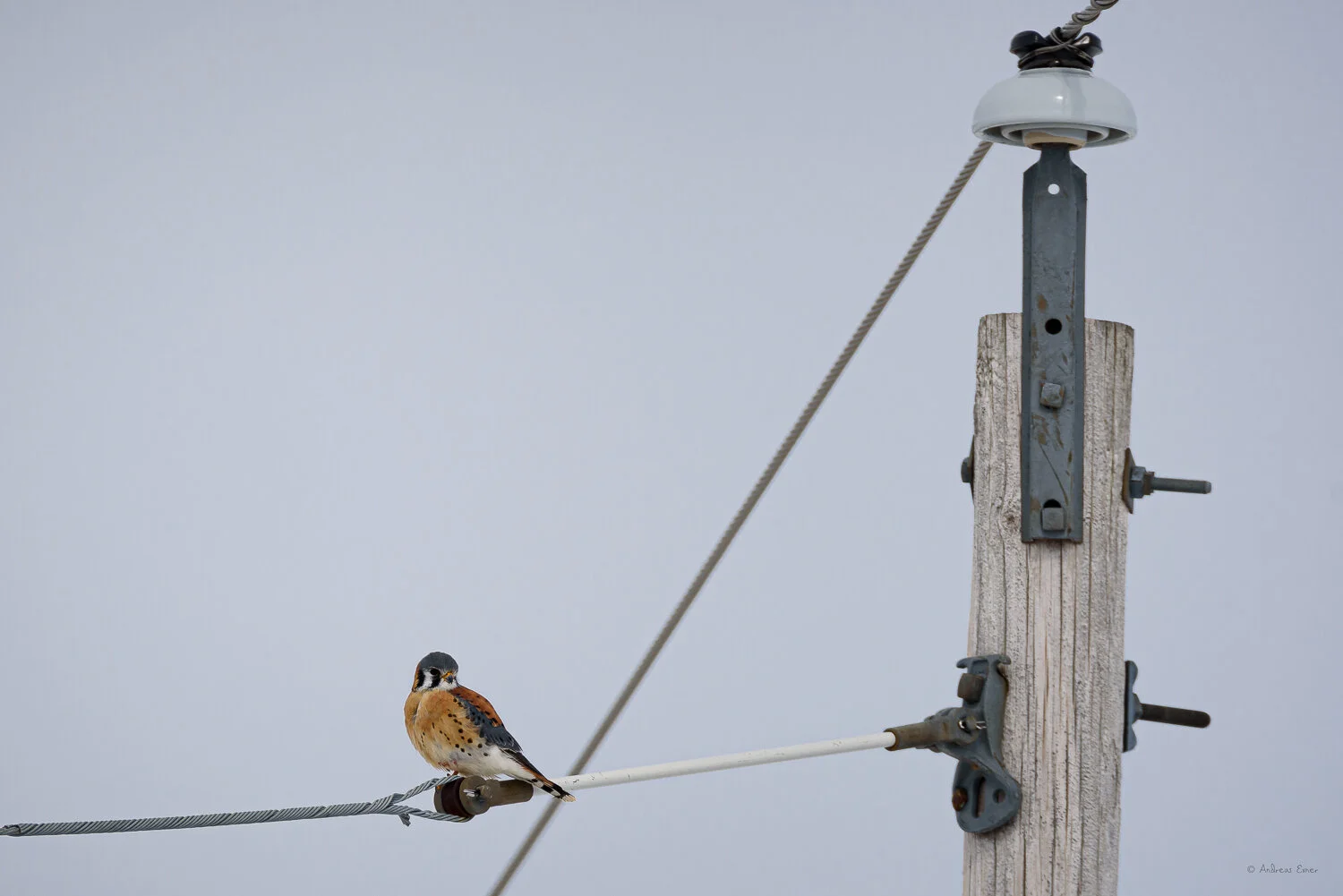 The second photo was made on my way back at the same spot. I didn’t see the male but the female American Kestrel perched nicely on the utility wire next to the road. This time I stopped almost beneath the bird but she didn’t pay attention to my presence at all and it took almost a minute before this little falcon turned her head in my direction.