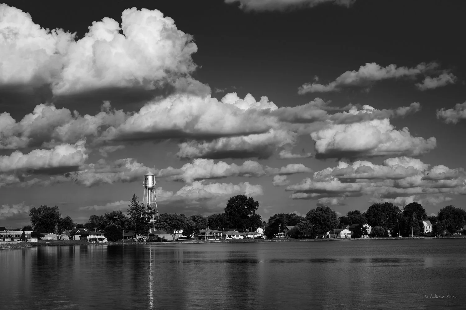 Sabula, Iowa’s only city located on an island in the Mississippi River, has two technical attractions I always like to look at. The first is their old-style water tower, which seems to be well maintained. If the sun is on the structure this tower stands out and can make for a nice reflection on the water. I have photographed it many times before but with the beautiful clouds we had during my last visit I could not resist to get the camera out again.