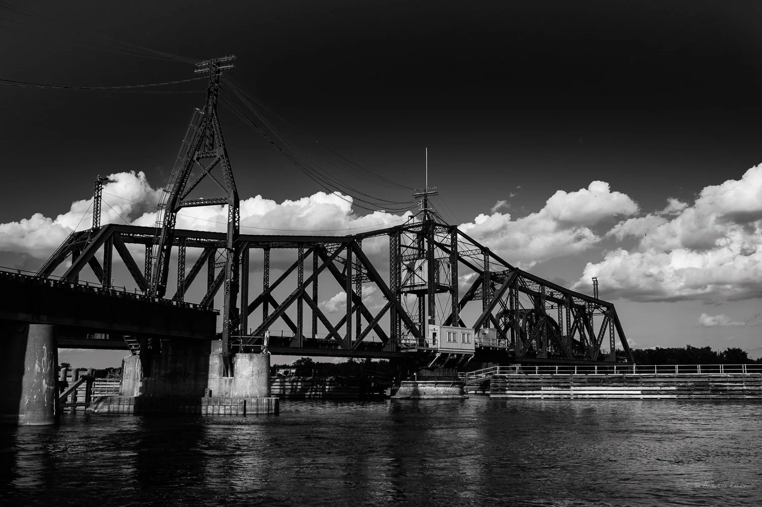 The other interesting structure that connects Illinois and Iowa across the Mississippi River is the Sabula Rail Bridge, a large through truss swing bridge. This time I was there at the right time. After a few small boats had just passed, the bridge started moving and was swiveled back and ready for the next train to get over it. It only took a few minutes and my photo shows it about half way closed. The clouds again made this shot stand out for me.