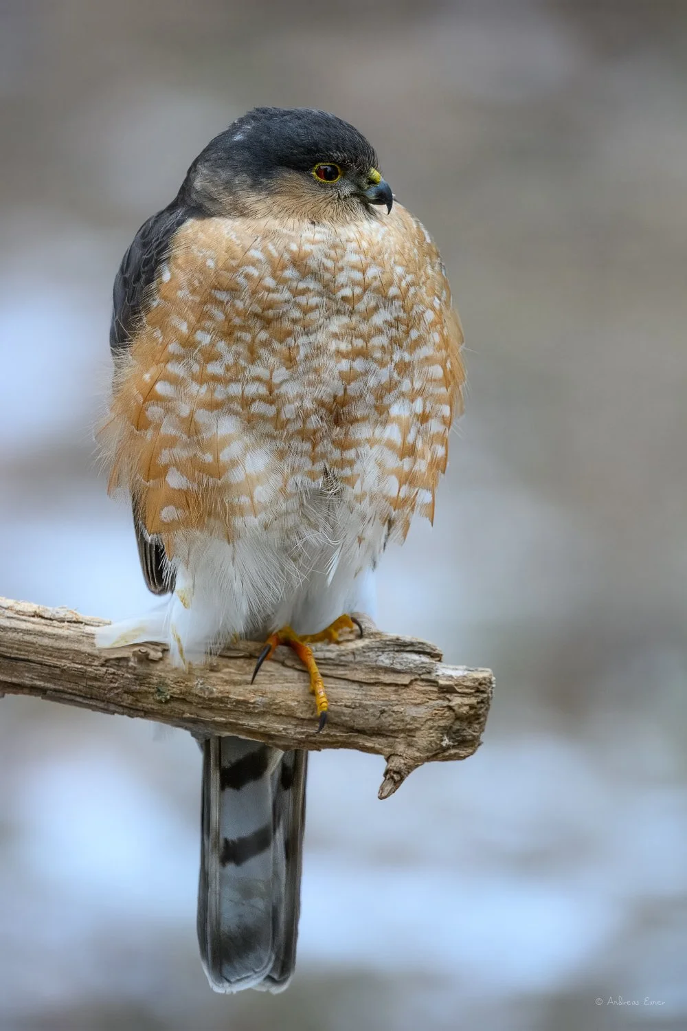 When I get out of bed I first have always a look through the window at our bird feeders and bird baths. No birds were present this morning and that quite often means that a predator is nearby. It took a couple seconds until I realized that our Sharp-shinned Hawk, that we see here during winter time , was sitting right next to the bird feeders on a perch that I had built for our feathered friends. Some of the smaller birds were hiding in a mountain pine that grows right beside the house and some juncos and sparrows were probably under the porch. The hawk knew it and had obviously missed a surprise attack earlier. The raptor was just waiting for another chance to strike.